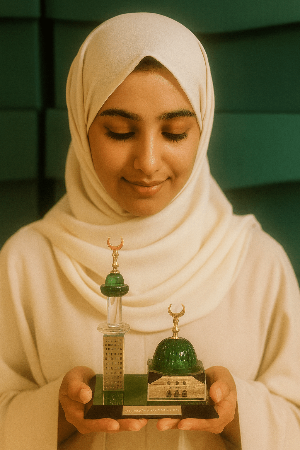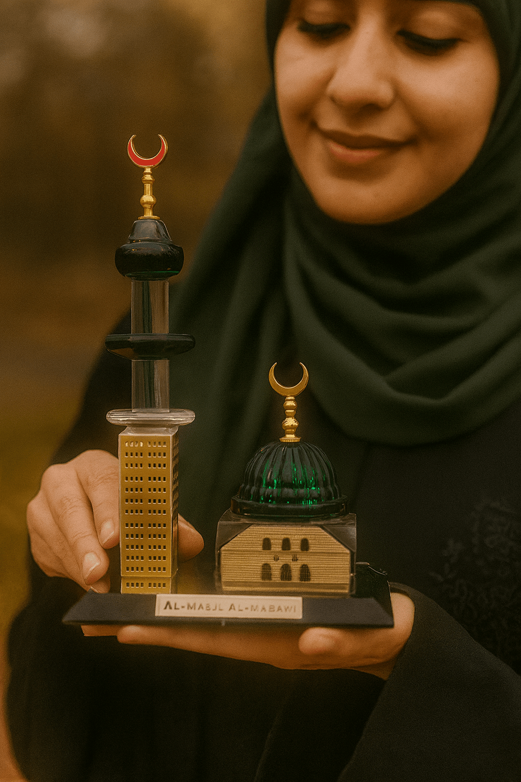 ✔ Green crystal dome with golden crescent – Symbolizing the iconic Green Dome of Medina.
