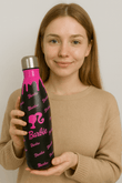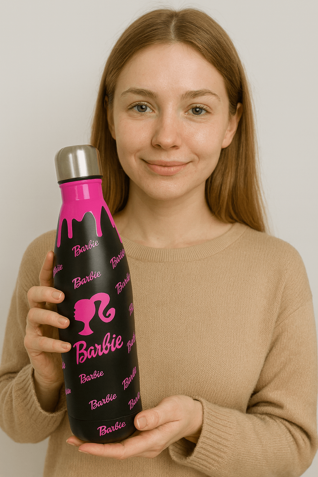 Barbie Stainless Steel Insulated Water Bottle – Pink & Black – A trendy and stylish bottle featuring the iconic Barbie logo with a bold pink-on-black design, perfect for fashion lovers and Barbie fans.