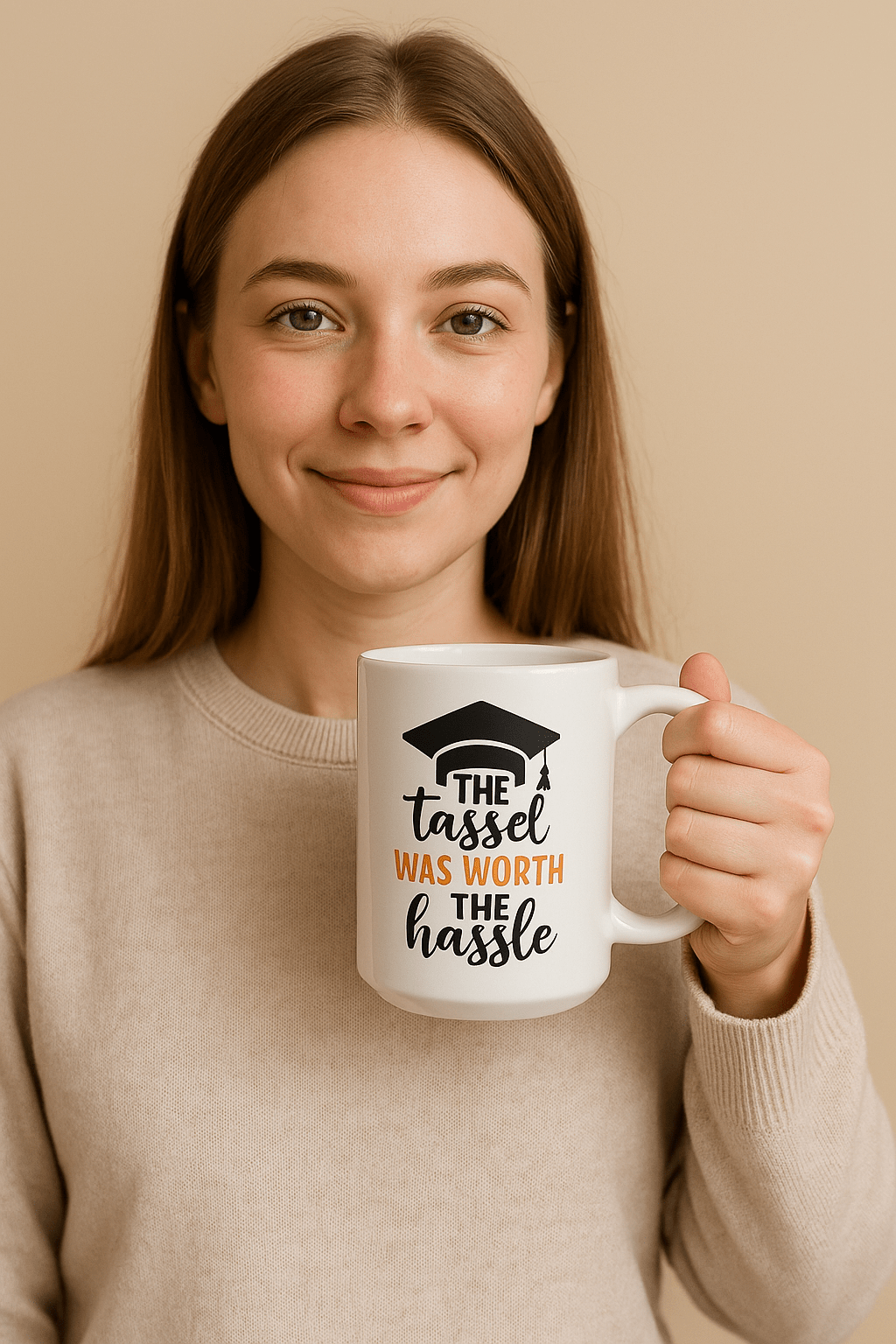 Graduation Mug – “The Tassel Was Worth the Hassle” – A cheerful ceramic mug designed to celebrate graduation milestones with a fun, motivational message.