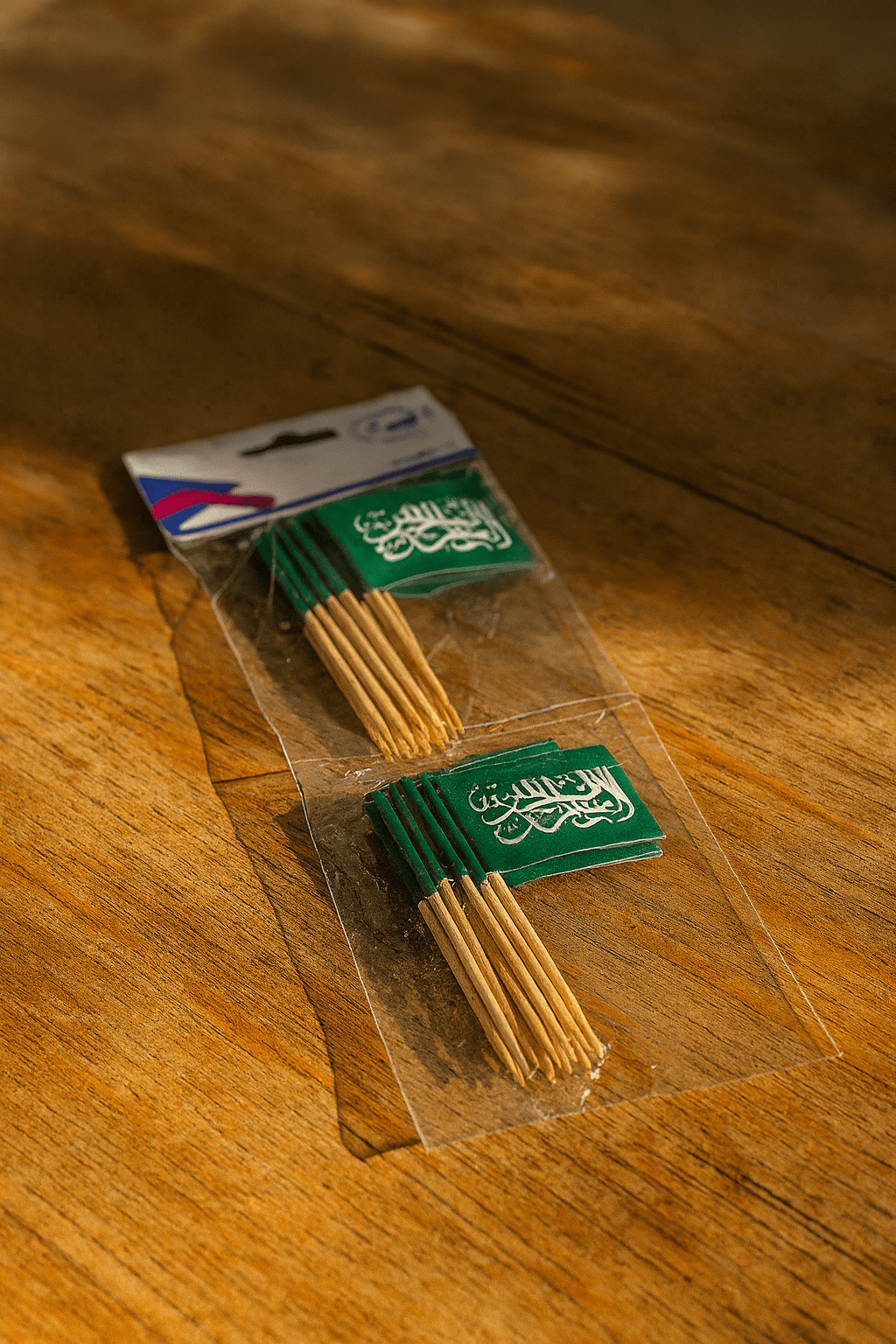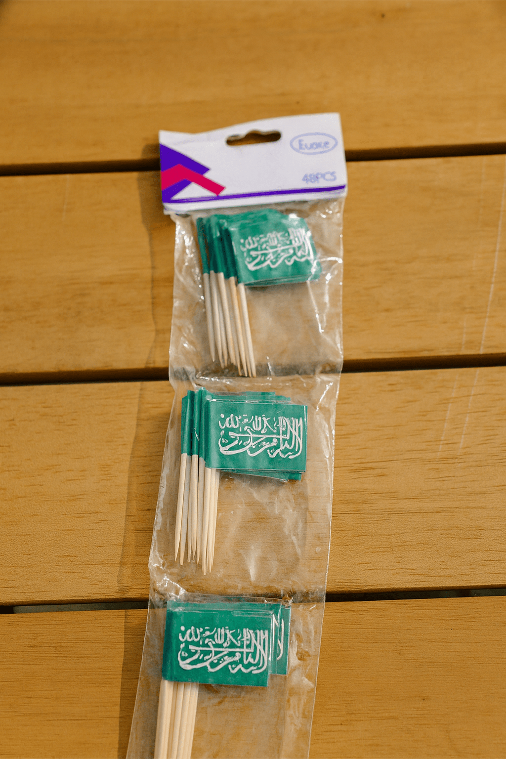 Mini Saudi National Day Flag Picks – A festive pack of small decorative flags on sticks, perfect for cupcakes, snacks, or table decorations during celebrations.