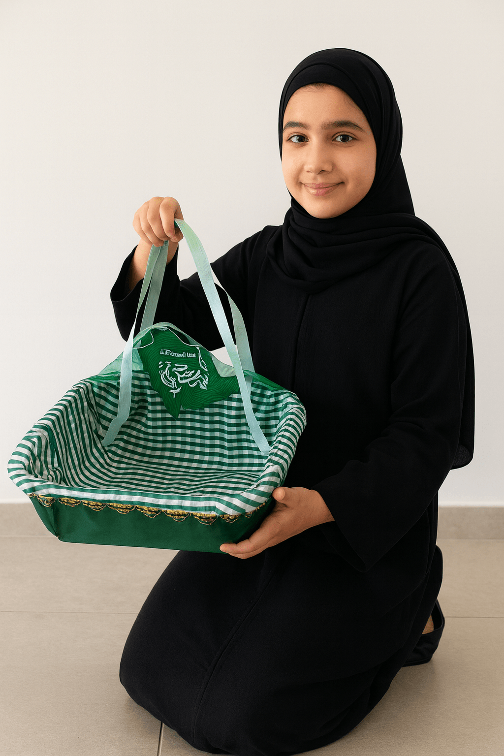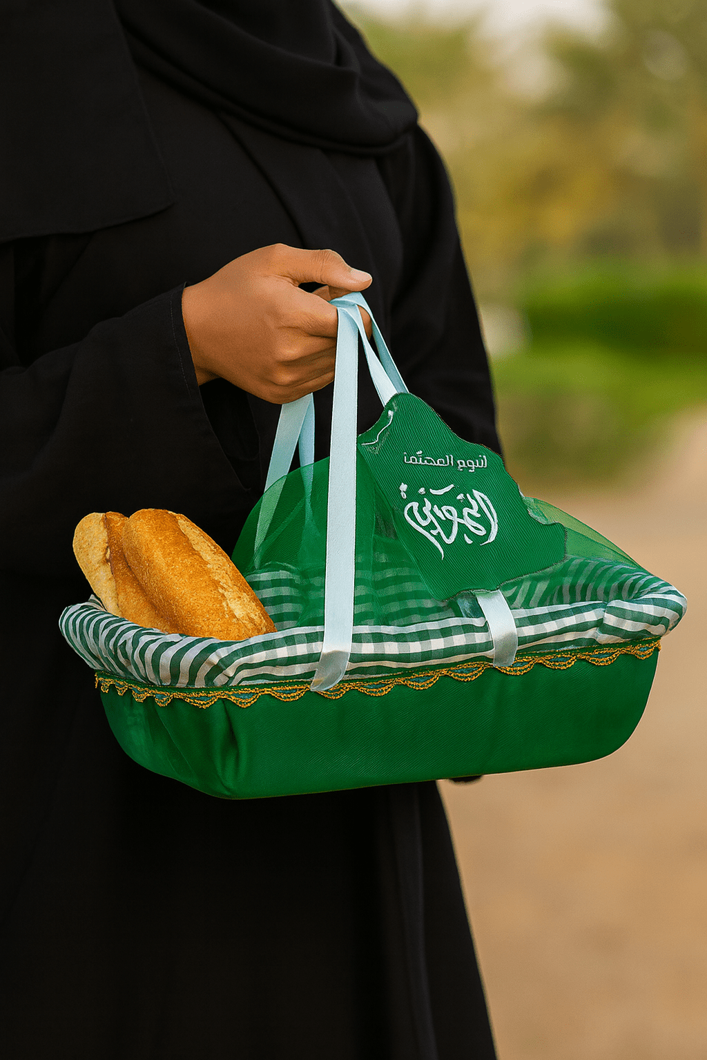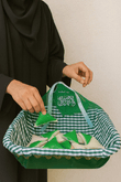 Saudi National Day Celebration Basket – A decorative green-themed basket perfect for showcasing gifts, treats, or party favors during Saudi National Day festivities.