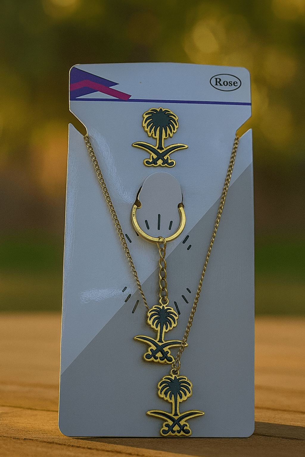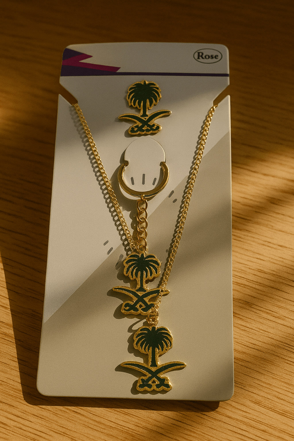 Rose Saudi National Day Jewelry Set – A patriotic accessory set featuring necklaces and keychains with Saudi-themed pendants, perfect for showing pride during National Day celebrations.
